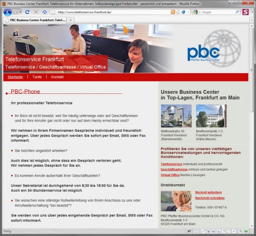 Mit den Angeboten "Telefonservice Frankfurt" und "Geschäftsadresse Frankfurt" präsentieren die PBC Pfeiffer Business Center auf zwei neuen Internetseiten ein reiches Angebot an Tarifen und Optionen: Beim Telefonservice für Firmen, einem virtuellen Telefonsekretariat, nehmen geschulte Sekretärinnen die Anrufe für den Kunden entgegen. Ebenso können Unternehmen eine exklusive Firmenadresse in Frankfurt anmieten, auf Wunsch mit zusätzlichem Büroservice und Service-Leistungen wie Telefonweiterleitung, Postservice oder Konferenzraum-Miete. Dieses Angebot ist ideal auch für einen zweiten Firmensitz oder für ausländische Firmen, die eine Niederlassung in Deutschland gründen wollen.