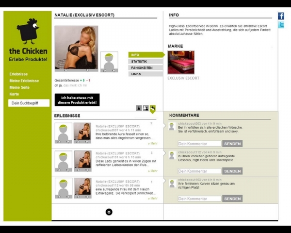 (IINews) - Passend zum warmen Sommerbeginn widmet sich das Team der Produkterlebnisplattform "the Chicken" (www.thechicken.com) einem heißen Thema: Prostitution. Die Dienstleisterinnen des horizontalen Gewerbes werden dabei wie ein klassisches Produkt auf der Plattform angelegt und können so von anderen Nutzern nacherlebt werden. "Wir haben da nicht lange überlegen müssen" so Christoph Schmid, CMO bei the Chicken. "Letztendlich erfüllen Prostituierte alle Kriterien eines klassischen Produktes. Die Wiedererlebbarkeit zu einem bestimmten Preis ist hier ebenso vorhanden, wie die prinzipiell gleichbleibende Art der Leistung und deren Qualität."