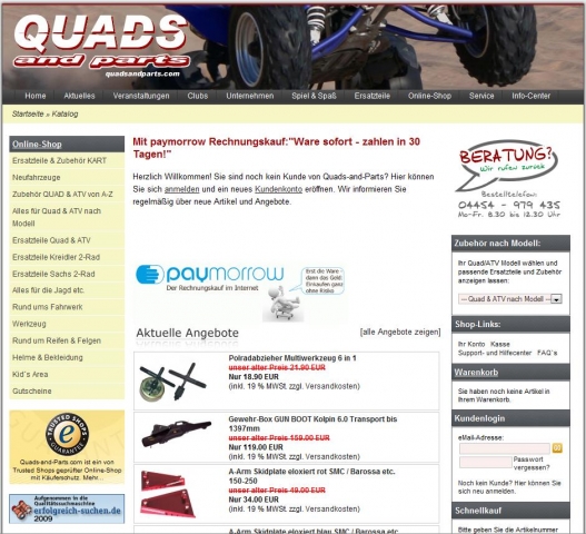 htttp://www.paymorrow.de/rechnungskauf rentiert sich: bei Quads-and-Parts® werden die Kunden schon mit der Info begrüßt, dass sie auf Rechnung kaufen können und ein Zahlungsziel von 30 Tagen haben. So stieg der Umsatz nach der Einführung des paymorrow-Rechnungskaufs vor einem Jahr bei Quads-and-Parts® um etwa 20%. Zudem haben die Kunden mehr Vertrauen in den Shop gewonnen, so dass sie mehr kaufen. D.h., die Größe Warenkörbe hat seither zugenommen bei nahezu konstanter Retourenquote; zusätzlich sorgt paymorrow für neue Kunden, die sich auch gerade deshalb für Quads-and-Parts® entscheiden, weil sie auch beim Erstumsatz schon auf Rechnung beliefert werden.