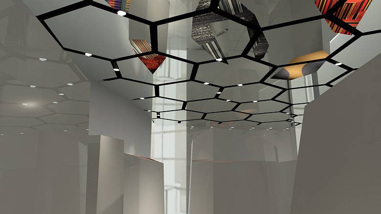 Die Präsentation des weltweit führenden Herstellers von nachhaltigen Teppichfliesen stammt von dem italienischen Designer Francesco Maria Bandini. In seiner traumhaft-surrealen Installation bewegt sich der Besucher durch ein Labyrinth aus strahlend weißen Stelen, deren Oberseiten mit den lebhaften, farbenfrohen Teppichfliesen von InterfaceFLOR gestaltet sind. Die Anordnung der Stelen erinnert an Erde, die durch Hitze und Trockenheit aufgeplatzt ist. Dieser Hinweis auf den weltweiten Klimawandel steht symbolisch für das klare Bekenntnis des Unternehmens zur Nachhaltigkeit. In der mit wabenförmigen Spiegeln ausgekleideten Decke werden die Farben und Muster der Teppichfliesen reflektiert. So wird die Wahrnehmung des Besuchers buchstäblich auf den Kopf gestellt. Er wird zum Innehalten und Nachdenken angeregt. Gleichzeitig dienen die Muster aber auch als Orientierungshilfe im Irrgarten.