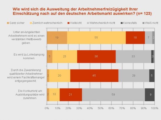 Drei von vier Personalmanagern glauben, dass die Ausweitung der EU-Arbeitnehmerfreizügigkeit zu einem verstärkten Wettbewerb unter an- und ungelernten Arbeitnehmern führen wird. Bezüglich der Befürchtung, dass es durch zu Lohndumping kommen könnte, gehen die Einschätzungen auseinander: 28 Prozent der Befragten halten eine solche Entwicklung für wahrscheinlich; 35 Prozent gehen davon aus, dass es kein Lohndumping geben wird. Dass durch die Zuwanderung qualifizierter Arbeitnehmer aus Osteuropa einem Fachkräftemangel entgegengewirkt werden kann, meinen lediglich 22 Prozent der Befragungsteilnehmer. Auswirkungen auf den Ausbildungsmarkt sind nach Ansicht der meisten befragten Personalmanager (68 Prozent) nicht zu erwarten.