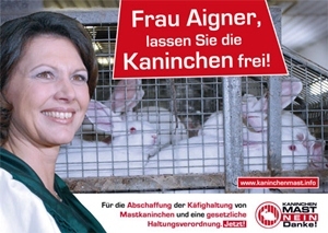 Die neue Kampagne des Tierschutzbündnisses"Kaninchenmast, nein danke"nimmt die Politik beim Wort und verteilt ab sofortüber die Seite www.kaninchenmast.info Postkarten sowie den Aufruf zur Beteiligung an der E-Mail-Aktion, gerichtet an die verantwortliche Bundesagrarministerin Ilse Aigner. Mit der Aktion soll die Wichtigkeit der Umsetzung von Verbesserungen im Tierschutz unterstrichen werden