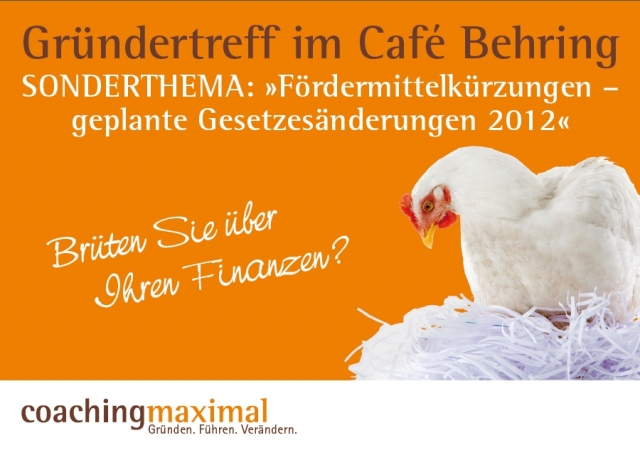 Der Gründertreff im Berliner Café Behring findet erstmals am 16.05.2011 ab 18 Uhr statt und informiert dabei auch über die zu erwartenden Fördermittelkürzungen. Die Neuregelungen betreffen hauptsächlich die Änderung des bisherigen Rechtsanspruches zur Ermessensleistung, die Verkürzung der Grundförderung (Arbeitslosengeld I plus 300 Euro) von neun auf sechs Monate und die Verlängerung der Aufbauförderung (300 Euro) von sechs auf neun Monate. Zusätzlich wird Unternehmensberaterin Birgit Baum zum Thema "Gründungszuschuss und Gründercoaching - neuer Stand und geplante Änderungen" sprechen.
