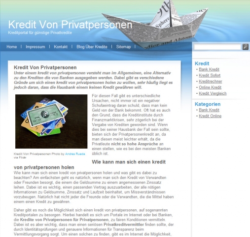 Portal http://www. kreditvonprivatpersonen.net ist ein deutsches Portal für Kreditsuchende. Hier gibt es eine grosse Auswahl an Kredit-Informationen und alle zusätzliche Anweisungen, wie jede einzelne Person seinen Kredit kriegen kann.