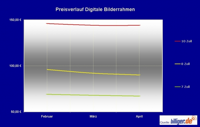 Digitale Bilderrahmen (http://www.billiger.de/show/kategorie/102974.htm) mit einer Displaydiagonale von 10 Zoll liegen noch deutlich über der 100-Euro-Marke. Im Februar kostete ein Gerät dieser Größe rund 146 Euro. Bereits im März fiel der Durchschnittspreis bei billiger.de um rund 1,4 Prozent auf 144 Euro und hielt sich auch im April konstant auf diesem Niveau.