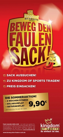 (IINews) - Sulingen, 23. Mai 2011 - Keine faulen Ausreden mehr: Unter dem Motto "Beweg den faulen Sack" führt kingdom of sports, einer der führenden Anbieter von Clubfitness in Norddeutschland, eine originelle Sommerkampagne vom 1. Juni bis 31. Juli durch, die zum Mitmachen auffordert und dabei noch einem guten Zweck dient. Und das Beste: Jeder Teilnehmer ist ein Gewinner. Denn wer sich vom 1. Juni bis 31. Juli für echt freundliche 9,90 Euro zum vierwöchigen Fitnesstraining anmeldet, tut etwas für seine Gesundheit und unterstützt gleichzeitig Dunkelziffer e.V., einen Verein, der sich für sexuell misshandelte Kinder einsetzt. Der Clou der Sommerkampagne, entwickelt übrigens von der renommierten Hamburger Agentur Jung von Matt, sind die Aktionstage an allen Standorten. Hier werden Preise im Wert von über 150.000 Euro ausgelobt. Einzige Bedingung: Beweg den faulen Sack. Der Veranstaltungsauftakt findet am Samstag, 4. Juni 2011, von 10.00 Uhr bis 20.00 Uhr im Einkaufszentrum Hamburger Meile in Hamburg-Mundsburg statt, bevor es am Freitag, den 10. Juni 2011, von 9.00 Uhr bis 19.00 Uhr im Einkaufszentrum Berliner Freiheit in Bremen weiter geht.