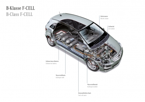 Die zukunftsträchtige Brennstoffzellen-Technik versteckt sich im Sandwichboden zwischen Vorder- und Hinterachse. Diese Zwischenboden-Lösung wurde erstmals vor zwölf Jahren beim Forschungsfahrzeug Necar 4 verwendet, das auf Basis der ersten Generation der A-Klasse mit komprimiertem Wasserstoff (H2) fuhr. Die B-Klasse F-CELL kommt heute doppelt so weit und ist mit 136 PS/100 kW auch mehr als 40 PS stärker. Dabei ist das Brennstoffzellen-System, genannt Stack, wesentlich kleiner geworden, und der Verbrauch ist um ein Drittel gesunken. Ein weiterer Fortschritt besteht in der deutlich verbesserten Kaltstartfähigkeit des Stacks: Selbst wenn das Thermometer minus 25 Grad Celsius zeigt, lässt sich die B-Klasse F-CELL noch starten.