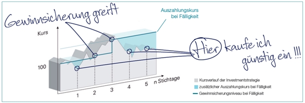 (IINews) - Dieses neue Konzept bietet neben einer Kapitalsicherung eine kontinuierliche, dynamische Gewinnsicherung, indem der jeweils höchste an monatlichen Stichtagen festgestellte Anteilspreis der jeweiligen Anlagestrategie zum Ende der vereinbarten Laufzeit festgeschrieben wird.