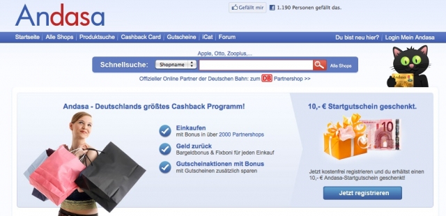 Andasa ist mit mehr als 2000 Shops Deutschlands größtes Cashback Programm. Das Portal bietet einen tagesaktuellen Gutschein Blog, Übersichten über versandkostenfreie Shops, Shops mit dem Trusted Shops® Siegel und tägliche Sonderangebote. Registrierte Nutzer können sich jeden Einkauf mit 2% Bargeldbonus vergüten lassen, der ab einem Betrag von 30 Euro auf das Konto des Nutzers überwiesen wird. Gutscheine, Rabatte und Sonderaktionen sind mit dem Bargeldbonus kombinierbar. Andasa zahlt ein Startguthaben von 10 Euro und einen Extrabonus für geworbene Freunde. Die Nutzung ist kostenlos.