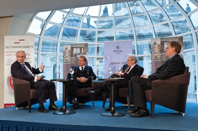 Zur Diskussion hatte der Verband DIE FÜHRUNGSKRÄFTE zwei weitere namhafte Gäste geladen: Den Vorstandsvorsitzenden der Charité, Prof. Dr. Karl Max Einhäupl, sowie den Leiter der Berliner Feuerwehr, Wilfried Gräfling. Moderator Michael Märzheuser von der MärzheuserGutzy Kommunikationsberatung entlockte seinen drei Interviewpartnern nicht nur Informationen über zukunftsfähige Führungskonzepte, seine Gesprächspartner gaben auch Auskunft über die unbequemen Aufgaben eines Chefs und die Bedeutung von Charisma. Gastgeber Ronald van Weezel, General Manager des Hilton Hotels, stellte auch in Aussicht, dass weitere Hilton Talks in Berlin folgen würden.
