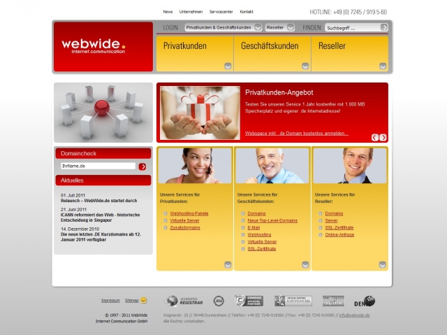 (IINews) - Klare Strukturen, hohe Bedienerfreundlichkeit und modernes Design - der neue Webauftritt von WebWide (http://www.webwide.de/) überzeugt auf ganzer Linie. Die ruhige, großflächige Optik in den warmen Firmenfarben rot und gelb wirkt professionell und sympathisch. Man hält sich gerne hier auf, nicht zuletzt, weil das Zurechtfinden so einfach ist. Ob Privatkunde, Geschäftskunde oder Reseller. Jeder hat seinen eigenen Bereich der klar erkennbar auf der Startseite liegt.