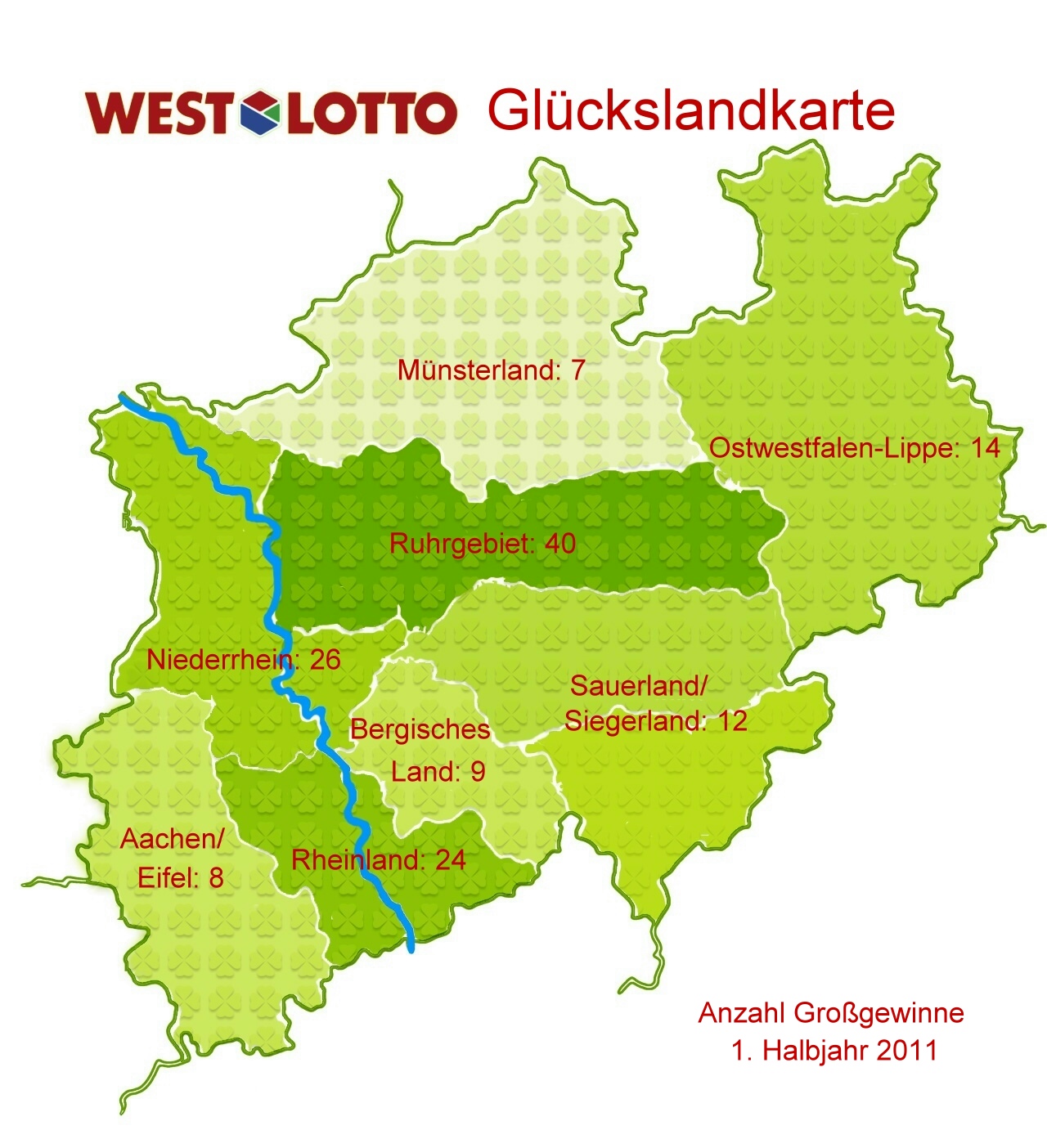 Das Ruhrgebiet hat in Sachen Glück zurzeit die Nase vorn. 40 Großgewinne in der ersten Jahreshälfte 2011 sind absolute Spitze. Und auch die Plätze zwei und drei auf unserer Landkarte des Glücks sind ähnlich wie das Ruhrgebiet durch einen Fluss geprägt. 26 Großgewinne (über 100.000 Euro) gingen an den Niederrhein, 24 ins Rheinland. In Ostwestfalen-Lippe schüttete Glücksgöttin Fortuna ihr Lotto-Füllhorn 14 Mal aus. Zwölf Mal hat das große Glück im Sieger- und Sauerland zugeschlagen, neun Großgewinne gingen ins Bergische Land, acht in den Raum Aachen/Eifel. Sieben Mal wurde schließlich im Münsterland ganz besonders gejubelt, wo die WestLotto-Zentrale ihren Unternehmenssitz hat.