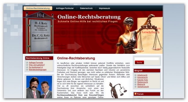 Die Rechtsanwaltskanzlei Hans Jürgen Kotz und Dr. Christian Kotz ist spezialisiert auf Online Recht. Eine neue Seite macht jetzt auch online jegliche Rechtsberatung möglich.