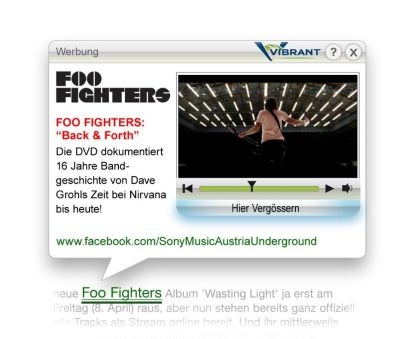 Besonders erfolgreich wirbt derzeit die Sony Music Entertainment Austria GmbH für die Dokumentation der US-Rockband Foo Fighters. Ziel der Kampagne, die noch bis Ende August auf österreichischen und deutschen Websites gezeigt wird, sind Downloads auf iTunes. Dazu wurden neben dem Band-Namen auch Keywords wie Albumcharts, Lieblingssongs, Rockmusik oder Song downloaden im Vibrant Themenchannel Entertainment gebucht. Das Werbefenster zeigt ein Video zur Bandgeschichte und verlinkt zur Facebook-Page von Sony Music Entertainment.
