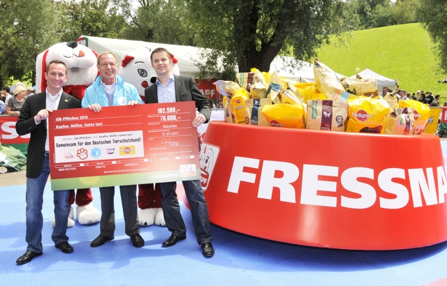Symbolisch spendete Fressnapf zusammen mit Pedigree und Whiskas obendrein auch den Inhalt des größten Fressnapfs der Welt - insgesamt zwei Tonnen Hundefutter - an den Deutschen Tierschutzbund, namentlich an das Tierheim München.