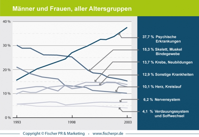 Zweitens spielt der eigene Beruf bei der Bewertung oft eine große Rolle. Wer nicht körperlich arbeitet, sondern am Schreibtisch sitzt, der macht sich keine Sorgen", so Dr. Dr. Michael Fauser, zuständiges Vorstandsmitglied im Versicherungsverbund Die Continentale. Gerade Akademiker, Besserverdiener, Selbständige und Beamte denken so. Aber genau das Gegenteil ist der Fall, da die Hauptursache Psyche und insbesondere die Diagnosen Burn-Out und Depressionen bei eben diesen Berufsgruppen vermehrt auftritt.