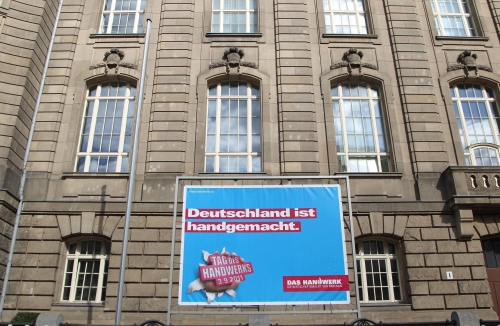 Der Bundesminister für Wirtschaft und Technologie unterstützt den Tag des Handwerks: Ein Großplakat wirbt vor dem Bundesministerium in der Berliner Invalidenstrasse mit dem Slogan: "Deutschland ist handgemacht".