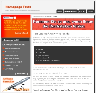 Homepage Texte ist eine Agentur, die sich mit dem Aufbau von Internetseiten beschäftigt. Kreative, junge Menschen wollen immer wieder mit einzigartigen und suchmaschinenfreundlichen Texten die Webseiten der Kunden verbessern. Wem seine Homepage wirklich am Herzen liegt, der sollte auch mal die wirklich guten Texter zu Zuge kommen lassen. Denn Eins sollte wohl jeder wissen, ohne ordentlichen Text kommt man im Internet nicht mehr weiter.