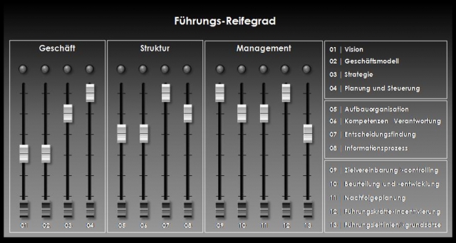 Die geschäftliche Ausrichtung, die Führungsstruktur im Unternehmen sowie die Einbindung und Entwicklung des Managements werden systematisch analysiert und anhand von Benchmarks aus der Studie und aufgrund der langjährigen Erfahrung in der Strategie- und Führungsberatung bewertet. Aus jeder Reifegradanalyse werden konkrete Handlungsempfehlungen abgeleitet, deren Umsetzung wichtige Beiträge dazu leisten, die Führungsarbeit in den jeweiligen Unternehmen konsequent zu verbessern.