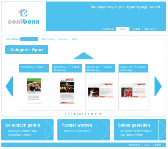 was im Bereich des lizenzierbarem Content verfügbar und nutzbar ist. So einfach wie ein Einkauf bei Amazon lässt sich das vielfältige Angebot von contboxx für die Nutzer handhaben. Der Content- Marktplatz startet mit über 160 verschiedenen Kanälen, deren unterschiedlichste Inhalte unabhängige von der Digital Signage Software gebucht und genutzt werden können.
