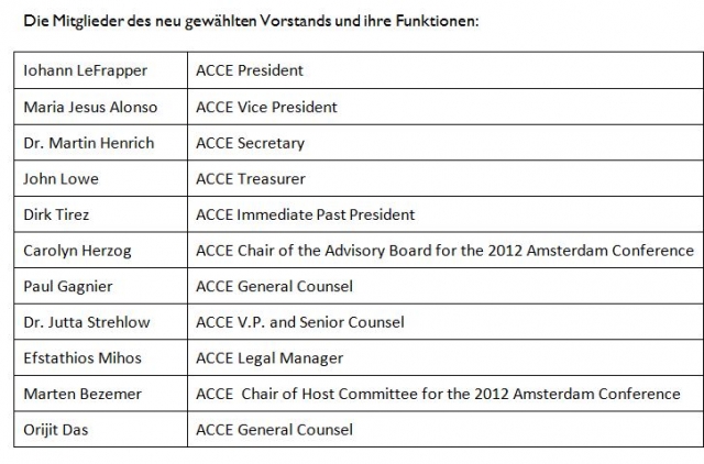 (IINews) - Die Association of Corporate Counsel Europe (ACC Europe), die europäische Vereinigung für Unternehmensjuristen, hat vor kurzem einen neuen Vorstand gewählt. Hauptaufgabe des Gremiums ist es, sich für die Interessen der Verbandsmitglieder auf europäischer Ebene einzusetzen. Iohann LeFrapper, General Counsel Networks Group, Alcatel Lucent, wird künftig als Vorstandsvorsitzender fungieren und löst damit Dirk Tirez, General Counsel and Corporate Secretary, BPost, ab, der als Immediate Past President im Vorstand verbleibt. Sabine Brumme, Syndikusanwältin bei der internationalen Unternehmensberatung BearingPoint, zieht sich nach fünf Jahren mit Erreichen der maximalen Amtszeit aus dem Vorstand zurück, ist jedoch weiterhin als Country Representative Germany tätig. Zusammen mit Carsten Lueers, Legal Counsel bei Verizon Deutschland GmbH, der sie im Frankfurter Raum unterstützt, und Matthias Reimer, Associate General Legal Counsel bei Oracle Deutschland B.V. & Co. KG in München, steht sie den Mitgliedern und Interessierten als Ansprechpartnerin zur Verfügung.