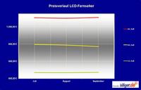 Eine andere Tendenz zeigt jedoch das Bild der LCD-Fernseher (http://www.billiger.de/show/kategorie/2060.htm) mit einer Display-Diagonale von 46 und 32 Zoll. Bei den größeren Modellen fiel der Durchschnittspreis im Erhebungszeitraum von 1156 auf 1150 Euro, im September machte er aber einen Sprung nach oben und erst bei 1159 Euro Halt. Die gleiche Entwicklung zeigt sich auch bei den Modellen mit 32 Zoll. Der Preis rutschte zuerst um einen Euro auf 519 Euro und kletterte im September dann bis auf 523 Euro hoch.