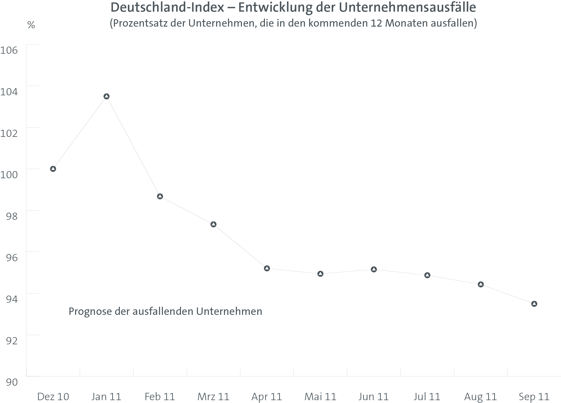 Der Index lag im September bei 93,5 Prozent. Damit werden binnen der kommenden 12 Monate 6,5 Prozent weniger Unternehmen ausfallen, als noch zu Beginn des Jahres prognostiziert. Das ist einerseits ein Ausdruck dafür, wie solide das Wirtschaftwachstum im ersten Halbjahr 2011 war. Andererseits verdeutlich der Index auch, dass das Wachstum über die Exportbranchen hinaus alle Bereiche der Wirtschaft positiv beeinflusst hat.