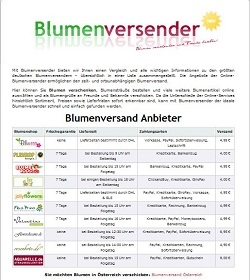 (IINews) - Mit dem Internetportal Blumenversender.net (http://blumenversender.net/) ist das Verschenken von Blumen an Mitarbeiter, Bekannte und Verwandte einfach, übersichtlich und kostengünstig geworden, da die zeitraubende eigene Recherche nach Preisen und Versandbedingungen entfällt. Dadurch können User des Portals die Vorzüge des Blumenversands über das Internet jetzt voll nutzen und die Bestellungen von Blumen beim richtigen Anbieter zeit- und ortsunabhängig vornehmen. Blumenversender.net bietet dabei eine Übersicht nicht nur der Preise, sondern auch der Lieferzeiten, Frischegarantien, Zahlungsmöglichkeiten uvm.. In einer übersichtlichen Tabelle werden dazu die verschiedenen großen deutschen Online-Blumenversender aufgelistet, so dass die wichtigen Parameter für die Wahl eines Anbieters sofort ersichtlich werden. Wer übrigens in Österreich Blumen versenden möchte, kann dies seit kurzen auch über das Portal Blumenversender.net vornehmen.