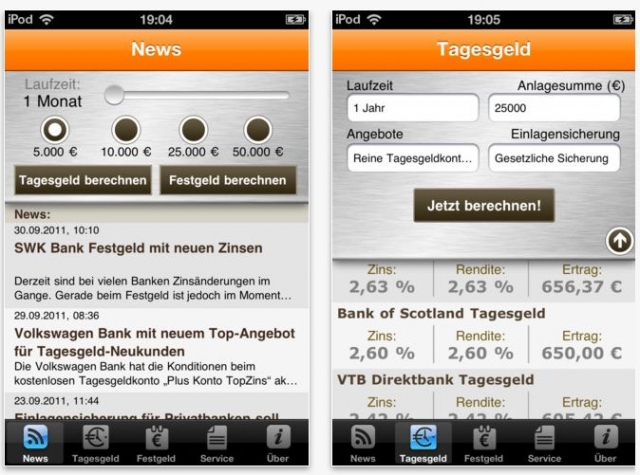 Die App setzt sich aus vier Modulen zusammen, die sich per Fingerzeig über das App-Menü auswählen lassen. Neben den Bereichen Tagesgeld und Festgeld stehen interessierten Anwendern zusätzlich noch ein News-Bereich sowie die Kategorie Service zur Verfügung. Unter "News" erhält jeder User aktuelle Nachrichten aus der Finanzwelt. Zudem werden Hintergründe des Finanzwesens, aktuelle Zins-Trends oder Informationen über einzelne Banken zur Verfügung gestellt. Im Service-Bereich liegen 30 wichtige Anschreiben, Anträge, Musterbriefe, Checklisten bereit, die die Kommunikation mit den Banken vereinfachen. IPhone-Nutzer erhalten die App im iTunes Appstore unter http://itunes.apple.com/de/app/id470250962?mt=8