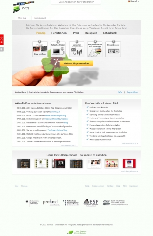 Über Pictrs: Pictrs ist das professionelle Shopsystem für Fotografen. Sie erhalten über die Plattform die notwendigen Tools an die Hand, um mit wenigen Klicks einen eigenen Foto-Webshop erstellen zu können. Anhand zahlreicher Vorlagen lässt sich das Layout individuellen Wünschen anpassen oder auch als Whitelabel-Lösung in die eigene Webseite integrieren. Neben den Downloadverkäufen können Fotografen in ihrem Shop auch viele weitere Fotoprodukte wie zum Beispiel Leinwände, Tassen oder Postkarten zum Verkauf anbieten. Die gesamte Abwicklung übernimmt dabei Pictrs. Damit wird der administrative und vertriebliche Aufwand für die Fotografen auf ein Minimum reduziert und ihnen gleichzeitig ein ergiebiger Vertriebsweg eröffnet.