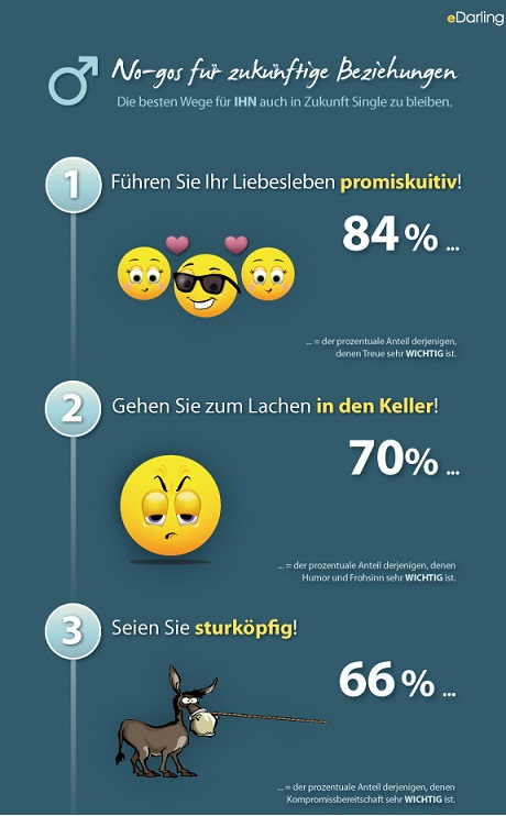 Berlin, 03.11.2011 – Schönheit liegt bekanntlich im Auge des Betrachters. Mit welchen inneren Werten Männer beim anderen Geschlecht punkten und womit sie nur verlieren können, hat nun die Online-Partnervermittlung eDarling analysiert. In Deutschland zählen Untreue, Humorlosigkeit und Sturköpfigkeit zu den No-Gos und bringen Frauen dazu, das Weite zu suchen.