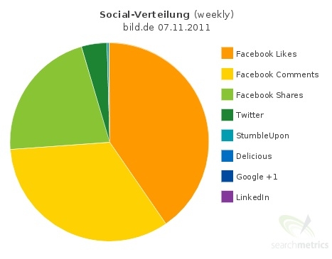 Die Grafiken verdeutlichen, dass Bild.de vor allem durch "Gefällt mir"-Angaben, Kommentare und die "Teilen"-Funktion auf Facebook den ersten Platz im Social Web behauptet: Insgesamt 95,48 Prozent der Social Media-Präsenz von Bild.de kommt über Facebook. Nur 4,15 Prozent der Inhalte werden über Twitter weitergegeben. Der Anteil der anderen Netzwerke ist mit 0,36 Prozent verschwindend gering. Im Vergleich mit Bild.de werden die Inhalte von Sueddeutsche.de häufiger über Twitter geteilt: 15,73 Prozent der Social Media-Präsenz von Sueddeutsche.de fällt auf Twitter. 1,93 Prozent der Sueddeutsche.de-Inhalte werden in den Netzwerken Delicious, LinkedIn, Google +1 und StumbleUpon veröffentlicht.