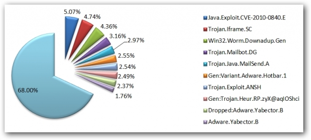 (IINews) - Java.Exploit.CVE-2010-0840.B sichert sich mit einer Infektionsrate von 5,07 % den ersten Platz im E-Threat Report und macht damit einen Sprung vom letzten Platz nach ganz vorn. Drei seiner "Artverwandten" sind ebenfalls vertreten: Trojan.Mailbot.DG auf Rang 4 (3,16 %), Trojan.Java.MailSend.A an Position 5 (2,97 %) sowie Trojan.Exploit.ANSH auf Platz 7 (2,54 %). Zusammen bilden sie einen Anteil von rund 14 % am gesamten Malware-Vorkommen in Deutschland. Alle vier Schädlinge machen sich eine Schwachstelle in der Java Virtual Machine zunutze, wodurch Applikationen Operationen durchführen können, die eigentlich nur ein eingeloggter User veranlassen kann. Um weitere Malware auf dem Rechner zu installieren, laden die E-Threats Browser Helper Objects (BHOs) herunter.