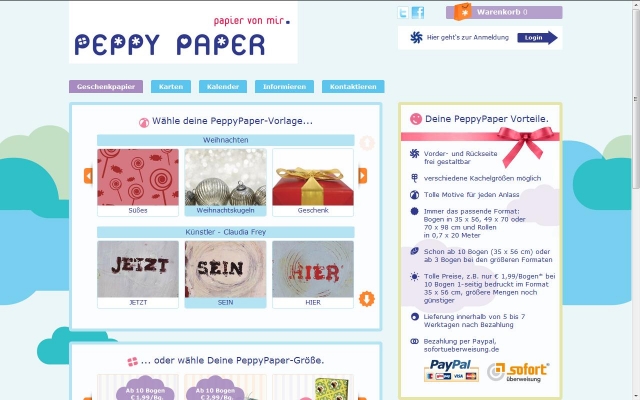 PEPPY PAPER ist ein Online-Shop, in dem Geschenkpapier und andere Drucksachen individuell gestaltet und editiert werden können. Dabei stehen dem Anwender verschiedene Hintergrund-vorlagen zur Verfügung, die nach Anlass (z.B. Weihnachten, Geburtstag, uvm.) sortiert sind. In der Kategorie "Muster" kann der Hintergrund völlig frei gestaltet werden. Durch das hochladen eigener Bilder und ganz persönliche Texte wird jedes Geschenkpapier zum Unikat. Drei Bogenformate von 35 x 56 cm bis 70 x 98 cm und das Rollenformat 0,7 x 20 m lassen auch hinsichtlich der Größe keine Wünsche offen. Nur wenige Tage nach der Bestellung hält der Geschenkpapier-Designer sein ganz persönliches Geschenkpapier in Händen.