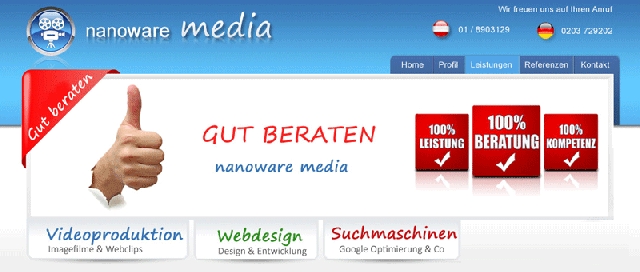 (IINews) - Die Online Marketing Agentur nanoware media (www.nanoware-media.eu), mit Standorten in Deutschland, 47055 Duisburg und Österreich, 1190 Wien bietet Webdesign, Suchmaschinenoptimierung und Videoproduktion aus einer Hand. Das Ziel der nanoware Experten ist es dabei, Kundenwünsche effizient und kostengünstig umzusetzen und zu einem qualitativ hochwertigen, schlüssigen Gesamtkonzept zu verarbeiten.