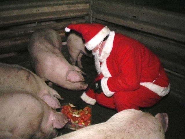 Der Weihnachtsmann der Albert Schweitzer Stiftung für unsere Mitwelt hat Schweine in der Massentierhaltung (Raum Cloppenburg) besucht, um ihnen die vielleicht einzige Freude in ihrem Leben zu breiten