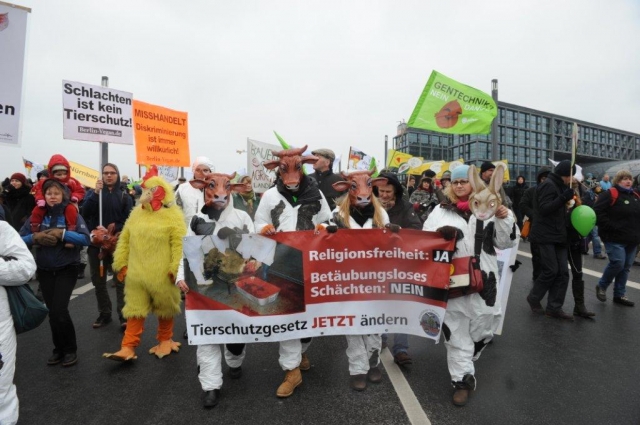 Die Aktivisten des Arbeitskreises haben die Kundgebung genutzt, um auf ein häufig vergessenes Thema aufmerksam zu machen: das betäubungslose Schächten von Tieren. Als Schaf, Rind und Huhn verkleidet trugen sie ein Banner mit der Aufschrift "Religionsfreiheit - ja, betäubungsloses Schächten - nein".