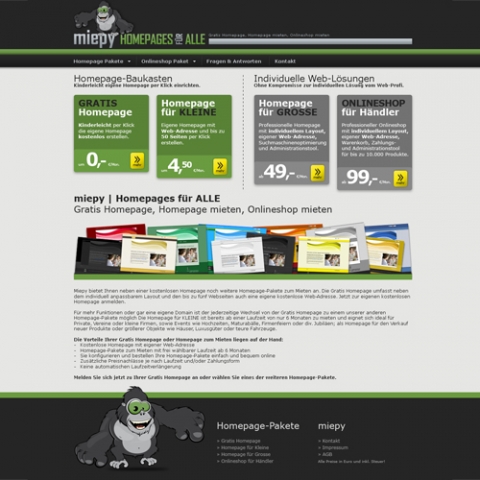 Miepy bietet seinen Nutzern zwei Homepage-Pakete zum selber bauen an. Die"GRATIS Homepage"und die"Homepage für KLEINE". Die"Homepage für KLEINE"umfasst eine eigene Top-Level Domain und bis zu 50 Seiten um jetzt nur noch Euro 4,50 pro Monat.