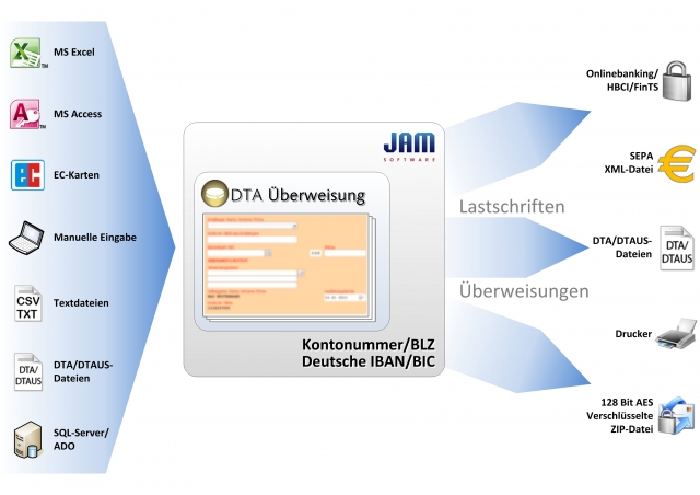 Außerdem zeigt sich DTA-Überweisung in der neuen Version 6 schon heute zukunftskompatibel: JAM Software bestätigt mit der Auszeichnung "SEPA-ready" (Single Euro Payments Area), dass DTA-Überweisung V6 für den einheitlichen Euro-Zahlungsverkehrsraum der Europäischen Union (EU) vorbereitet wurde und dieses Format für den innerdeutschen Zahlungsverkehr genutzt werden kann. Ab Sommer 2012 soll die Software Überweisungen im gesamten Euro-Raum in SEPA-Format umwandeln können. Gleichzeitig ist das Programm nicht nur mit einem breiteren Leistungsspektrum ausgestattet, sondern auch deutlich günstiger als andere SEPA-Konverter.