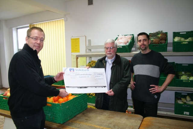 (IINews) - 2.500 EUR und unbezahlbares persönliches Engagement - das ist die Unterstützungsleistung der Rüsselsheimer Volksbank für die Tafel in Rüsselsheim. Fast 40 Mitarbeiter der Volksbank unterstützen die Tafel bei der Lebensmittelausgabe und bei der Abholung von Lebensmitteln bei Spendern. In einem gemeinsamen Projekt engagiert sich die Volksbank in ihrer angestammten Region bei der Tafel. "Für uns eine Selbstverständlichkeit.": sagte Vorstand Josef Paul anlässlich der Spendenübergabe am 26.1.2012 bei seinem Arbeitseinsatz in der Tafel und packte tatkräftig mit an. Carsten Heidebrink (Leiter Privatkundenmarkt) ergänzte: "Unsere Mitarbeiter haben sich begeistert zu diesem Einsatz gemeldet. Wir als Volksbank wissen, dass es im Leben auch die Schattenseiten gibt. Mit unserem Engagement möchten wir dokumentieren, dass wir unsere Verantwortung in der Region sehr ernst nehmen." Bis in den März hinein werden die Mitarbeiter der Volksbank aktiv die Tafel mit Arbeitseinsätzen unterstützen.