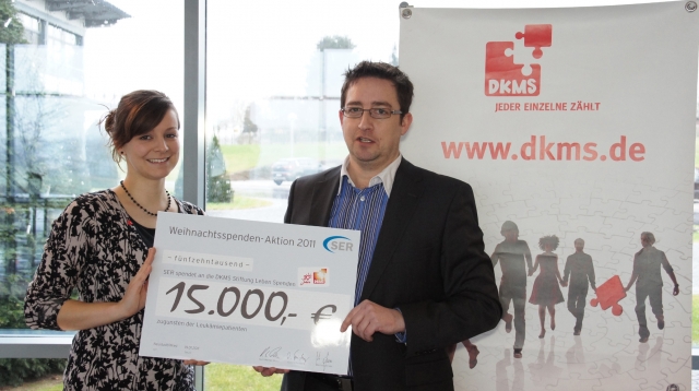 Unter dem Motto "Sie klicken, SER zahlt einen Euro" wurde die Weihnachtsaktion 2011 der SER Solutions zugunsten der DKMS Deutsche Knochenmarkspenderdatei durchgeführt. Anstelle einer Weihnachtskarte erhielt jeder Kunde und Interessent per E-Mail die Aufforderung, sich kostenfrei an der Aktion zu beteiligen. Für jeden durchgeführten Klick auf der eigens dafür programmierten Spendenwebsite erhöhte sich der Spendenbetrag um einen Euro. Die erreichten Klicks verdoppelte SER und rundete die Summe auf. Zusammen mit dem Erlös einer ähnlichen Aktion anlässlich der Eröffnung der neuen SER-Geschäftsstelle am Berliner Kranzler-Eck konnte SER der DKMS einen Scheck über den Spendenbetrag von 15.000 Euro überreichen.