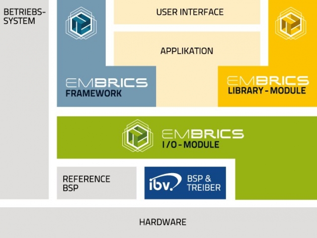 Aus dem EMBRICS Baukasten sind aktuell erhältlich: Framework-Module zur applikationsweiten Prozessdatenverwaltung, zum hierarchischen Softwareupdate, zum Systemstartup/-shutdown und für Basisdienste und -strukturen in Multitask-Anwendungen. I/O-Module für Sound und Signaltöne, digitale Eingaben, Wheel, Matrixtastatur sowie intelligente Batterien. Library-Module für portable Interprozesskommunikation, zum Lesen und Schreiben von Konfigurationsdateien und für komfortables Prozesslogging.