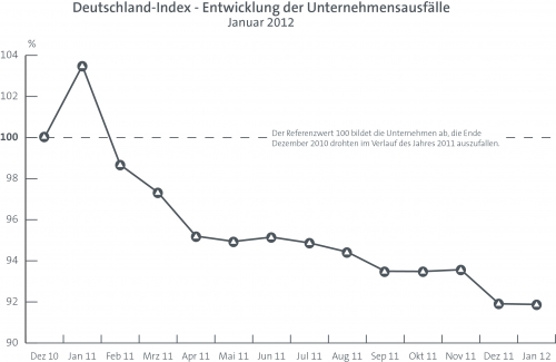 Der Wert 100 bildet die Gesamtheit der deutschen Unternehmen ab, die am 31. Dezember 2010 Gefahr liefen, in den darauffolgenden zwölf Monaten auszufallen. Die Entwicklung zeigt, dass der Umfang dieser Gruppe kleiner wird. Stand Januar 2012 werden 8,1 Prozent weniger Unternehmen ausfallen als noch Ende 2010 errechnet. Das bedeutet, dass es den Unternehmen in Deutschland in puncto Ausfallrisiko aktuell besser geht als zum Jahreswechsel.