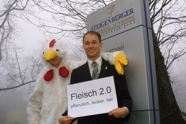 Die Fleischwirtschaft denkt neu: Zum 20. Deutschen Fleischkongress war dieses Jahr erstmals der Vegetarierbund zur Podiumsdiskussion geladen und präsentierte dort das pflanzliche Fleisch der Zukunft. Zum Auftakt des Kongresses sorgte ein menschliches Huhn mit dem Slogan"Fleisch 2.0 - pflanzlich, lecker, fair"für Aufsehen.