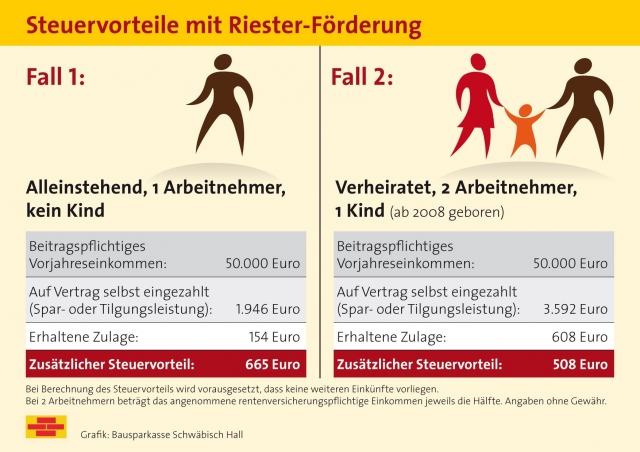 Zum Vergleich: Ein Arbeitnehmer-Ehepaar mit einem 2-jährigen Kind zahlt - bei gleichem Einkommen - auf seine beiden Verträge 4.200 Euro ein, davon 3.592 Euro aus eigener Kasse. Vom Staat bekommt die Familie zwei Mal die Grundzulage von 154 Euro plus die Kinderzulage von 300 Euro (für ein ab 2008 geborenes Kind), insgesamt also 608 Euro. Gibt die Familie ihre Einzahlungen als Sonderausgaben in der Steuererklärung an, werden vom Finanzamt zusätzlich 508 Euro gutgeschrieben.