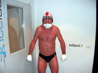mit Badehose, Handschuhen, Mütze,