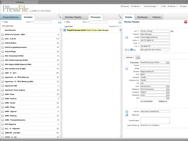 Bei einer Recherche im Internet wurde Euroforum auf den deutschen Anbieter PressFile Europe GmbH und die dort angebotene PR-Software aufmerksam. Mit PressFile stehen nun sämtliche Informationen zu einem Kontakt wie E-Mail-Adresse, Telefonnummern oder Adresse dem gesamten Team zur Verfügung - selbst wenn einzelne Mitarbeiter unterwegs sind oder sich im Home-Office befinden. Denn bei PressFile handelt es sich um eine browserbasierte Weblösung - sie kann daher überall benutzt werden, wo ein Internetzugang zur Verfügung steht. Mittels weniger Mausklicks verwalten die Euroforum-Mitarbeiter jetzt umfangreiche Verteiler. Einladungen, Presseinformationen oder Pressemappen können sowohl über personalisierte E-Mails als auch per Brief versendet werden. Dabei wird jeder Vorgang automatisch in der Kontakt-Historie protokolliert und dem User zugeordnet, so dass dieser auch Monate später noch nachvollziehbar ist. Zudem bietet die Dokumentation die Basis für Auswertungen und Berichte. Für Euroforum bedeutet dies: eine deutliche Vereinfachung in der Presse- und Öffentlichkeitsarbeit.