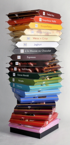 Fünf Wickelrohre auf einem Displayständer aus Metall nehmen vorgeklebte Schokotafel-Segmente auf. Diese werden dazu einfach durch leichten Druck auf ihre Laschen aufgerichtet und über das Wickelrohr gestülpt. Für den Handel bedeutet das: einfacher Aufbau durch den Ritter Sport Außendienst, kleine Grundfläche, dadurch flexibler Einsatz in großen wie in kleinen Läden und - im wahrsten Sinne - eine überragende Fernwirkung.