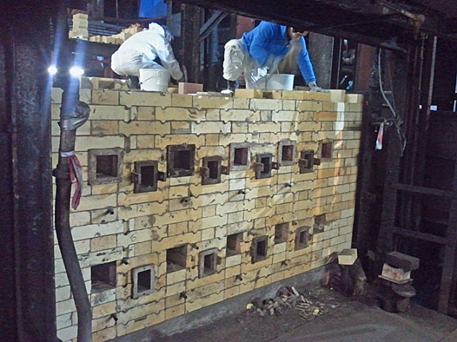 Im Januar 2012 begann man mit dem Neubau. Der Ofen besteht aus 84 verschiedenen Lagen, gemauert aus speziell gegossenen Formsteinen. Jede neue Lage wurde von den N.U.B.-Schamottsteinmaurern individuell nach Zeichnung ausgeführt. Eine Herausforderung war die enorme Größe des Ofens, die eine zusätzliche statische Abstützung erforderte. Hier war das spezielle Können und Know-how der N.U.B.-Stahlbauabteilung gefragt. Die Spezialisten verankerten die Anlage dauerhaft durch ein vor Ort errichtetes und verschweißtes Stahlgerüst mit dem Gebäude. Möglich gemacht wurde diese nachhaltige und stabile Sonderlösung durch den "Rundum-Service" von N.U.B. Engineering Ltd.