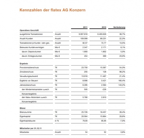 Der vollständige Geschäftsbericht 2011 der flatex AG steht auf http://www.flatex.de/ir zum Download zur Verfügung.?